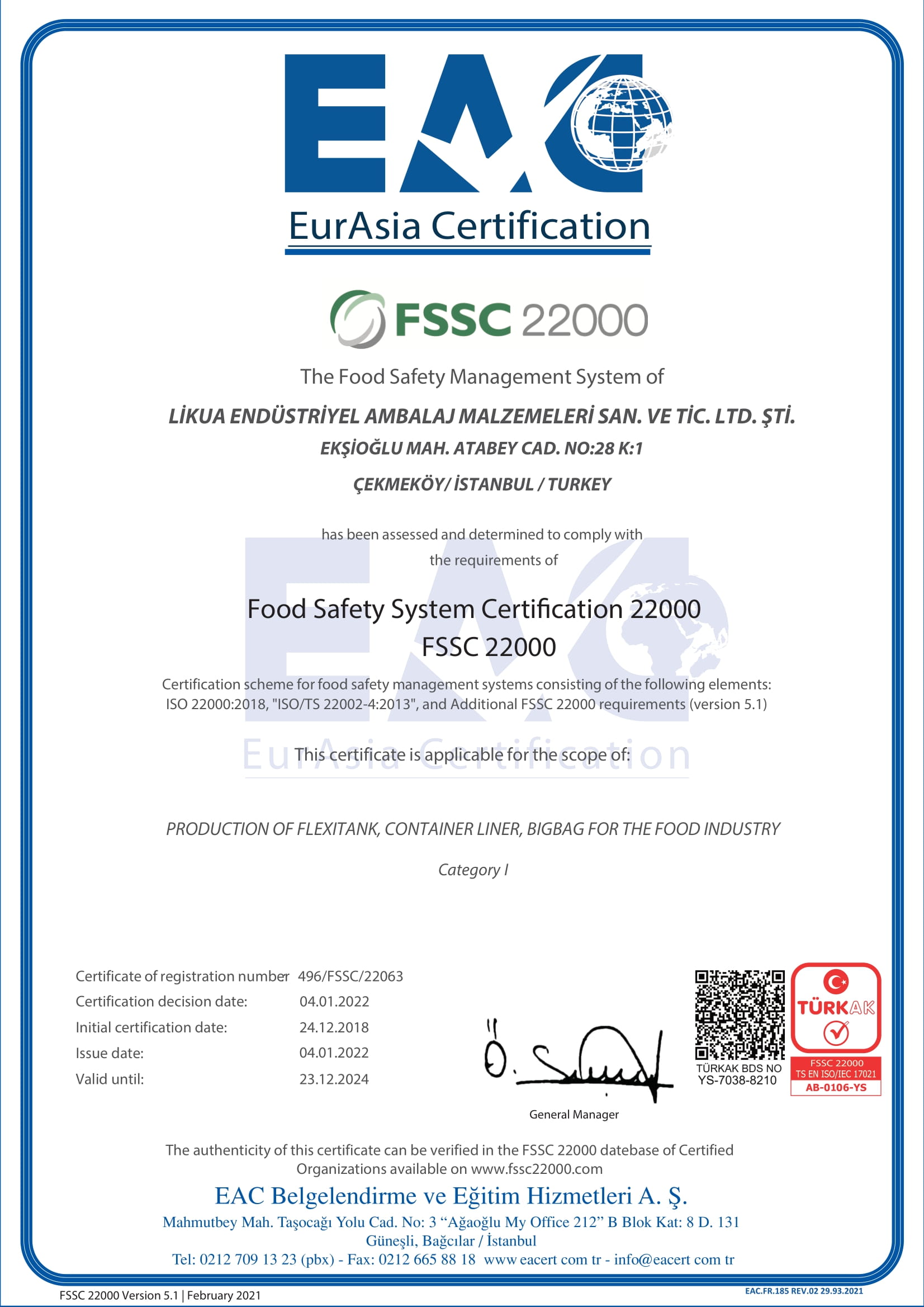 | FSSC 22000 | Food Safety System Certification (FSSC) 22000 is an internationally accepted certification scheme based on a combination of ISO 22000 sector specific Prerequisite Programs (PRP) and FSSC additional requirements. |