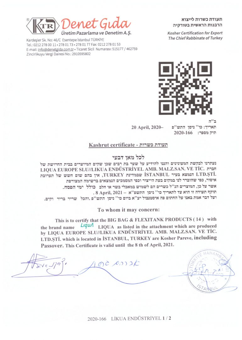 | Kosher Certificate | Certification that the products are Kosher Pareve ( neutral ) |